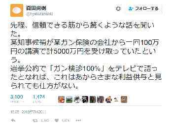 百田尚樹さん「某知事候補が某ガン保険の会社から講演料計5000万円を受け取っていた」とツイートし波紋