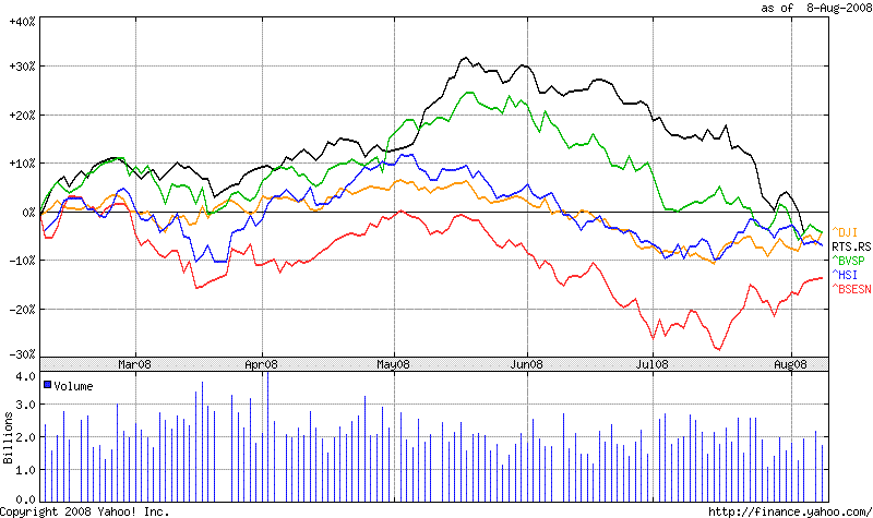 原油価格の下落で、ブラジル、ロシアの株価が下がってきています。画像1のチャートは、黒がロシア、緑がブラジル、青が香港、赤がインド、オレンジがダウです。