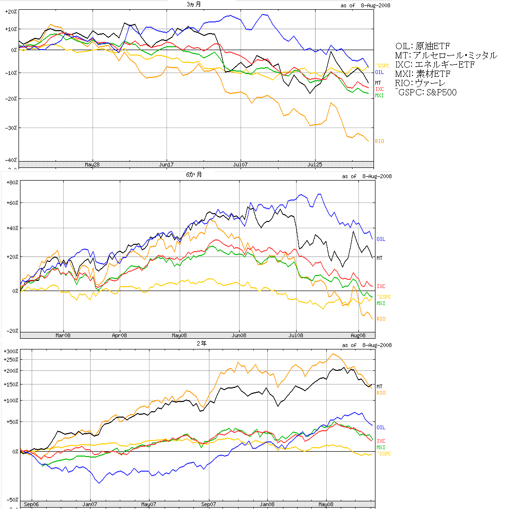 資源関連の個別銘柄とETFのパフォーマンスの比較。OILは原油価格(WTI)連動のETFだと思います。アルセロール・ミッタルは世界最大の鉄鋼メーカー。ヴァーレは主に鉄鉱石を売っているブラジルの企業。エネルギーETFの構成銘柄の上位は石油メジャー。素材ETFは素材といっても構成銘柄の上位はBHPビリトンなどの資源メジャー。