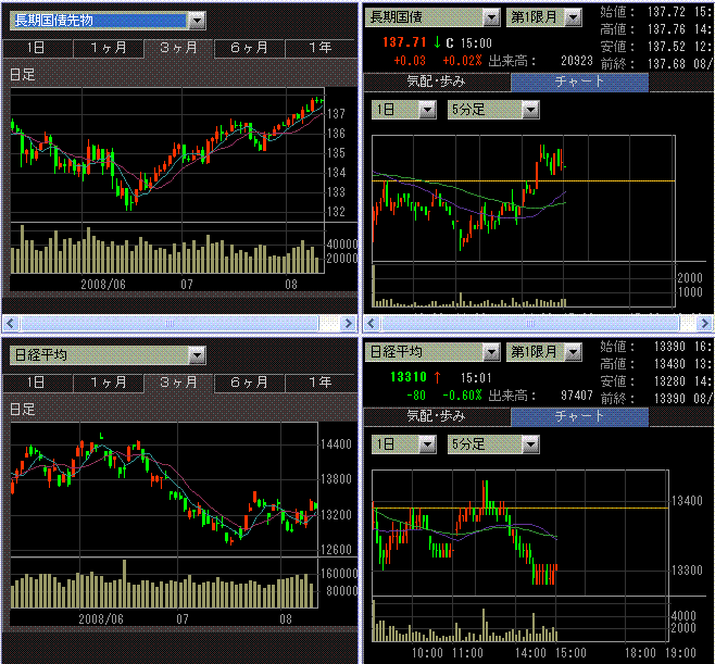 CMEの日経平均先物の終値は13400円付近。日本市場も寄りはその辺から始まりましたが、その後は終日13300円~13400円の間でフラフラしていました。業種で比較的強かったのは金融。昨日引け後に決算を発表した保険株に、買われる銘柄がいくつかありました。鉄鋼、非鉄、機械、商社といった景気循環株が弱かったです。やはりこの辺の銘柄は駄目か・・・と再確認させられるような弱さでした。