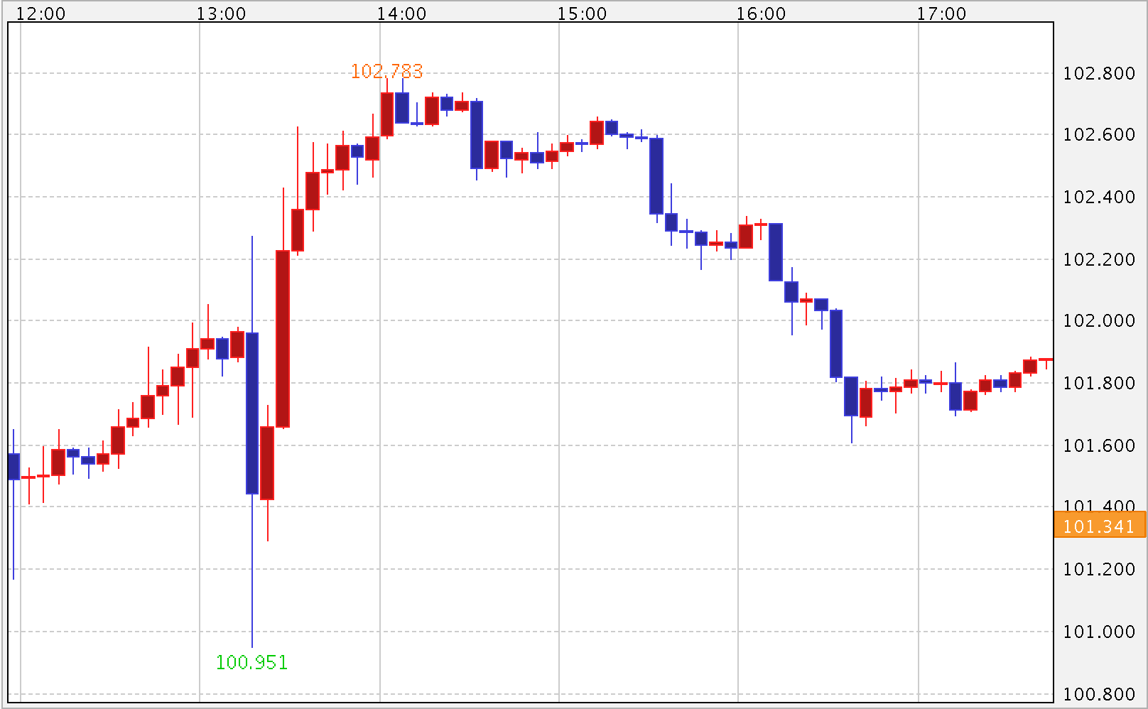 発表前後のドル円チャート。円安に傾くも結局は一時的でした…。