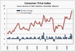 米労働省が14日発表した7月の消費者物価指数(1982-84年=100)は219.964となり、季節調整済みで前月に比べ0.8%上昇した。上昇率は6月の1.1%よりやや縮小したものの、市場予想の平均値である0.4%を大幅に上回った。前年同月比では5.6%上がり、91年1月の5.7%以来、17年半ぶりの大幅な伸びを記録した。