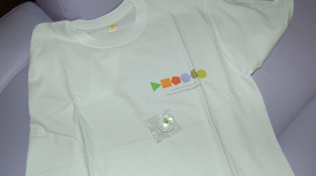 「みんなの株式」のロゴマーク(三角形から八角形までが並んでいるこの画面の左上にあるヤツ)から、たぶん事務局の方が気を遣ってくださったのでしょう,"みんなの株式"の文字を消去したデザインが胸に。これなら案外、普段着られそうかな・・・と思いきや!!