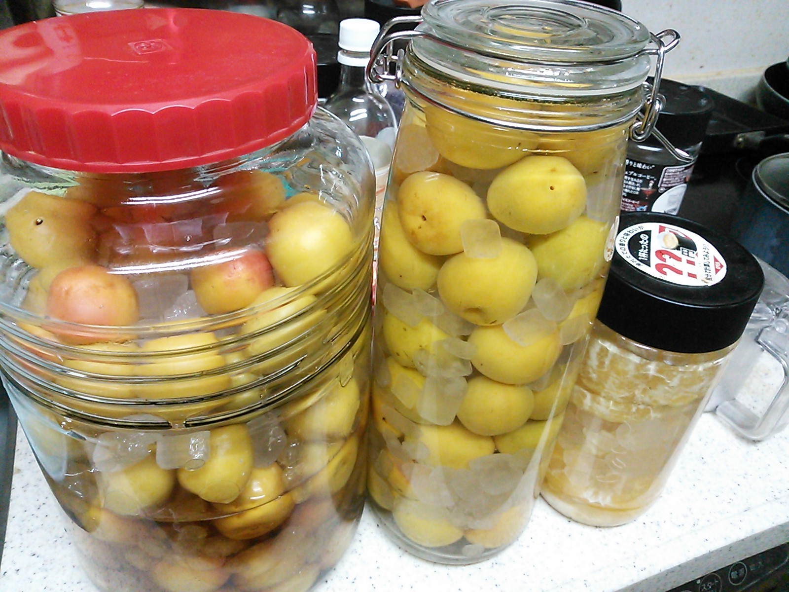 梅が余ったので海外ドラマに出てくるピクルス入れ?(おしゃれな入れ物、名前は知らない)を譲り受け、残りの梅と氷砂糖を詰め込み上からホワイトリカーを・・・