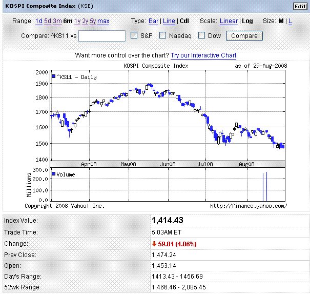 韓国株が弱いです。画像2は韓国の株価指数です(今日の分の値動きはまだ日足チャートに反映されていません)。韓国は、9月危機なども噂されていて通貨も売られていて・・・大丈夫なんですかね。中国株も売られました。週末に四川南部で起きた地震が重しになったようです。