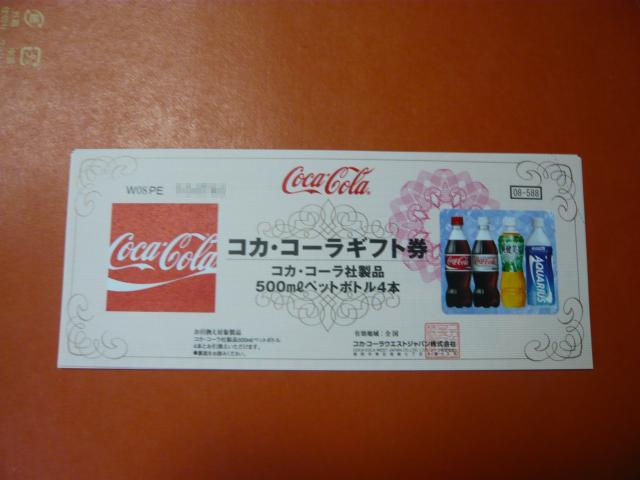 のコカコーラ社ギフト券(1枚で500ml製品4本と引換え) がもらえます。このギフトカードはスーパー等では1枚588円の商品券としてコカコーラ社以外の商品の買い物にも使用できますので使い勝手は良いですね(^^)