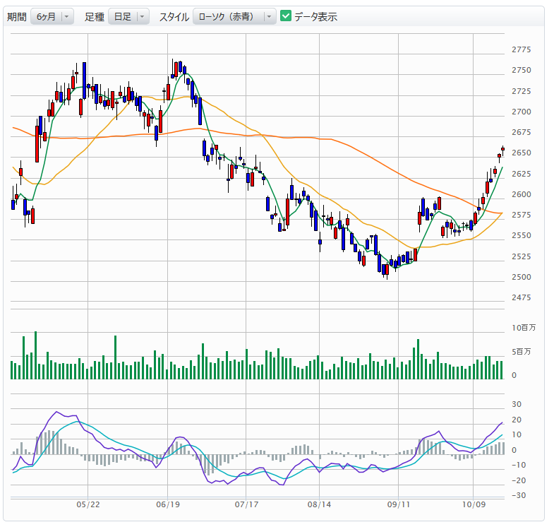 株高が年末まで続く感じなので、どこかの銘柄を買っておくべきかと。