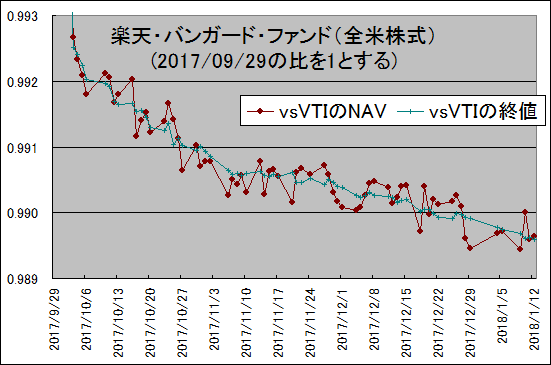 ・ファンド価格とVTI価格(NAV・終値)の比の推移