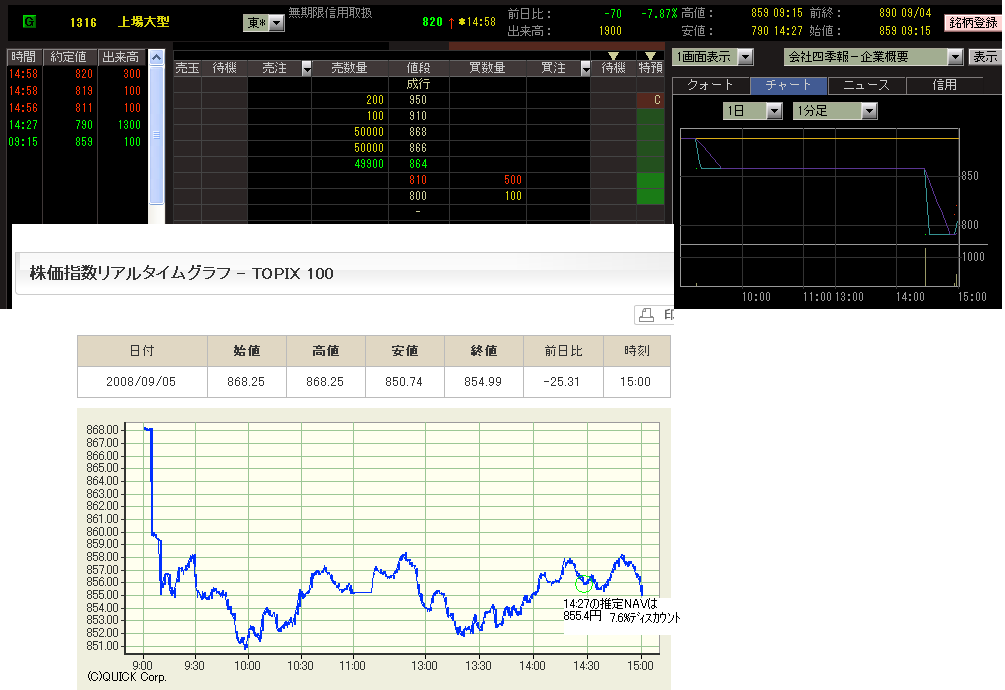 上場インデックスファンドTOPIX100日本大型株(1316.T)が一時S安となりました。
