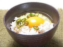 青唐辛子はヘタを切って、目立った種を振り落とし、細い小口切りにして器に入れ、しょうゆを注いで混ぜて10分以上置く。溶いた生卵を青唐辛子醤油で味付けして、熱々のごはんにかけて混ぜて食べる。