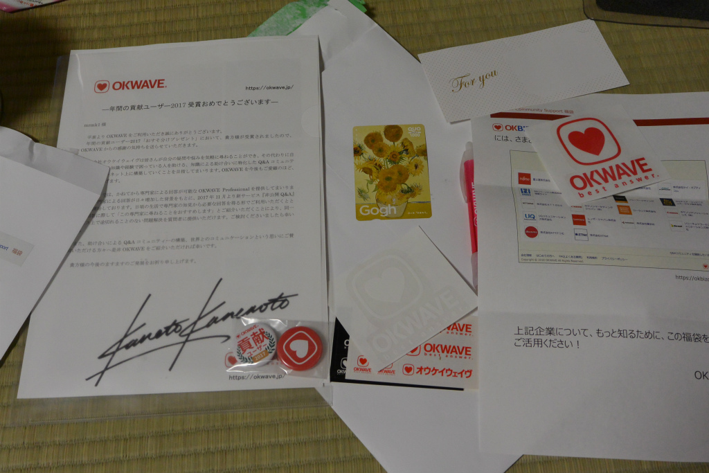 貧祖なバッジの他は、貧相なボールペンと貧祖なシールが2枚、1000円のクオカードなんか付けて、、、潰れませんかな、、、こんな良いもの付けて