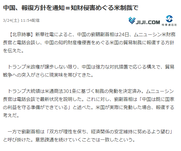 これとは別にトランプ大統領は通商法301条に基づき、中国の知的財産権侵害への貿易制裁発動を命じる文書に署名。最大で年間600億ドル(約6兆3000億円)相当の中国製品に25%の関税を課す見通しで、中国商務省は「貿易戦争を決して恐れない。十分な準備ができている」と報復で応じる姿勢を鮮明にした。