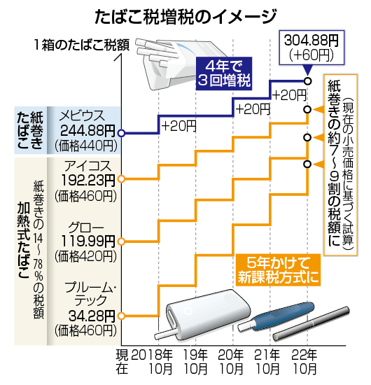 段階的に5年後に1箱が、アイコス550円、プルームテック650円になります。