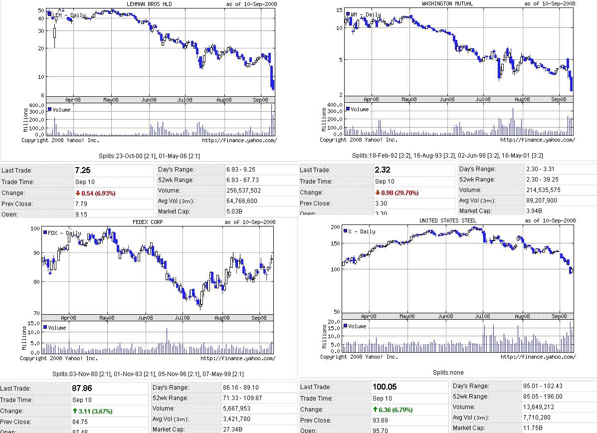 経営危機に陥っているリーマンは、朝方に経営再建策と3Q決算を発表しましたが危機脱出への進捗は示せず、失望感からリーマン株は続落となり、他の金融株にも安いものが目立ちました。資源、素材といったこれまで売り込まれていた景気敏感株がリバウンドし、株価指数はプラス引けとなりました。
