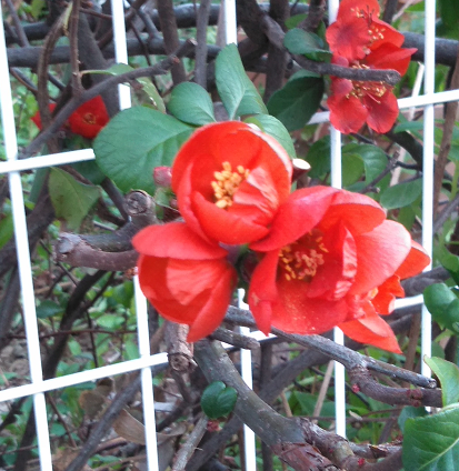 こっちはボケ(木瓜)の花。本来は春の花ですが、秋だろうが冬だろうが少し暖かい日があると見境なく咲きます。