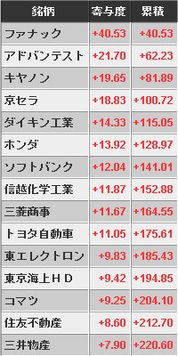 日経平均の上位15銘柄で431円56銭の半分を稼ぎ出す