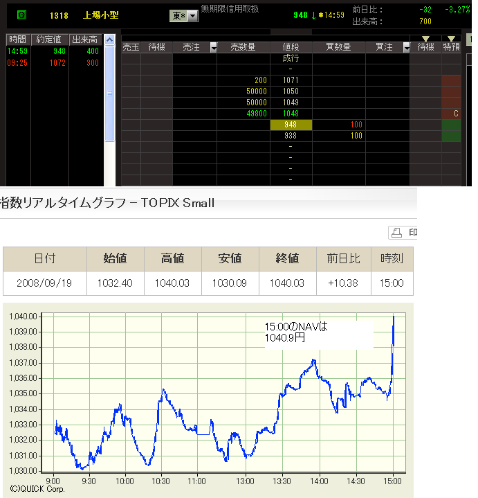 14:59の推定NAVはよくわからないので、公式基準価額1040.9円で考えると、取引価格948円は9%弱のディスカウント。