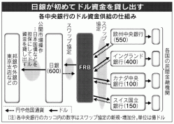 日米欧の主要六中央銀行は18日、米金融危機のあおりで欧米民間銀行を中心にドル資金調達が難しくなっているため、各国中銀が協調して総額1800億ドル(約19兆円)のドル資金を自国市場に供給する緊急対策を発表した。日銀は米連邦準備理事会(FRB)と総額600億ドル(約6兆3000億円)の通貨スワップ協定を結び、外国銀行を含む金融機関に直接ドルを貸し出す。民間のドル資金融通の機能が弱まるなかで、各国中銀が民間の金融仲介の役割を肩代わりする異例の措置に踏み込む。