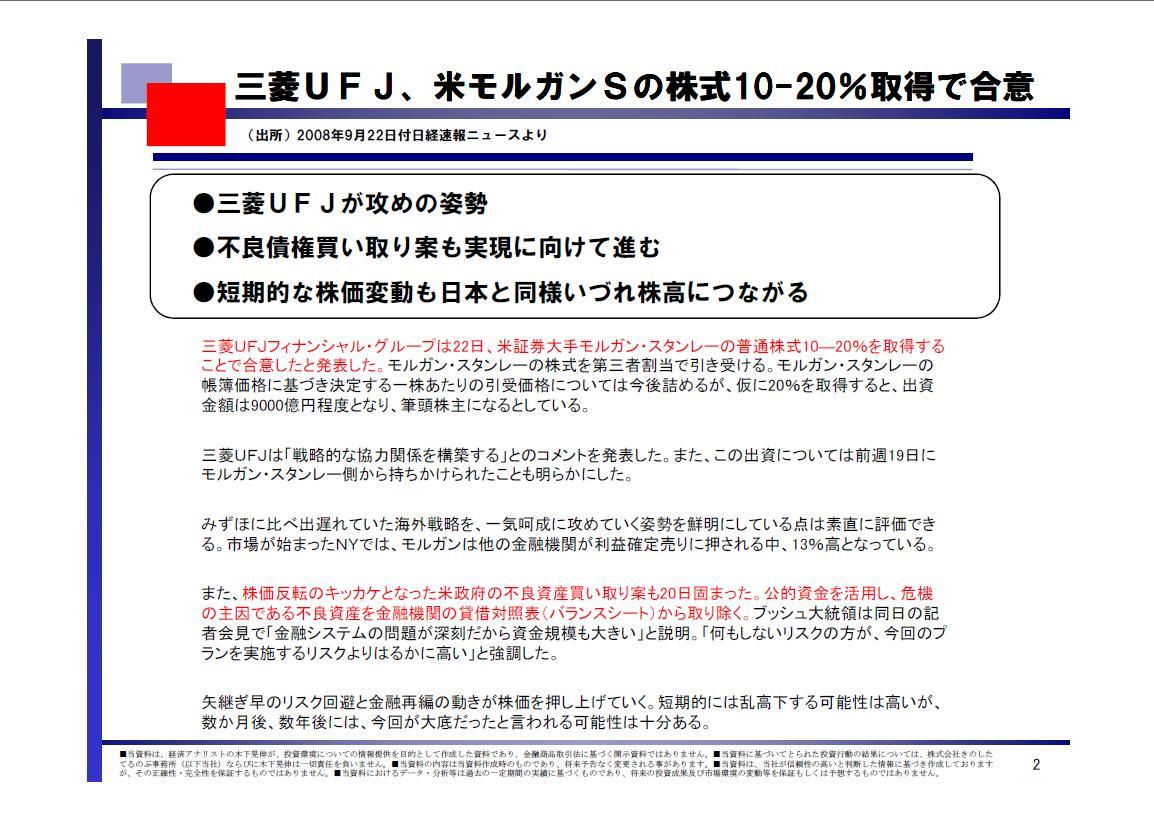 1.三菱UFJ、米モルガンSの株式10-20%取得で合意