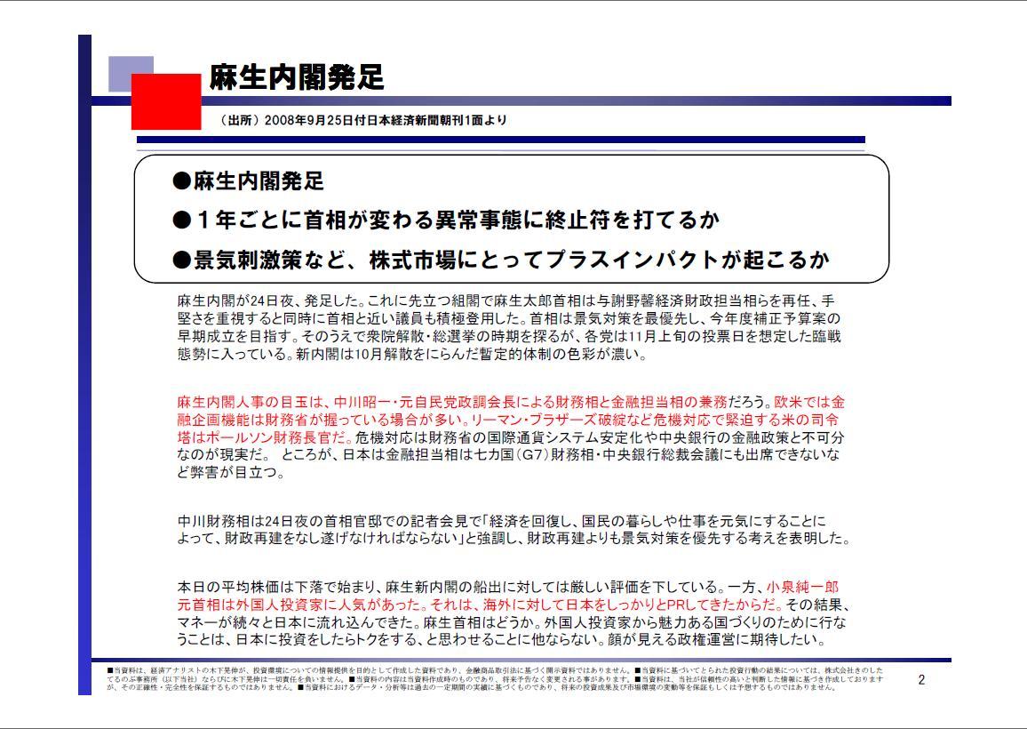 麻生新内閣の船出に対しては厳しい評価を下している。