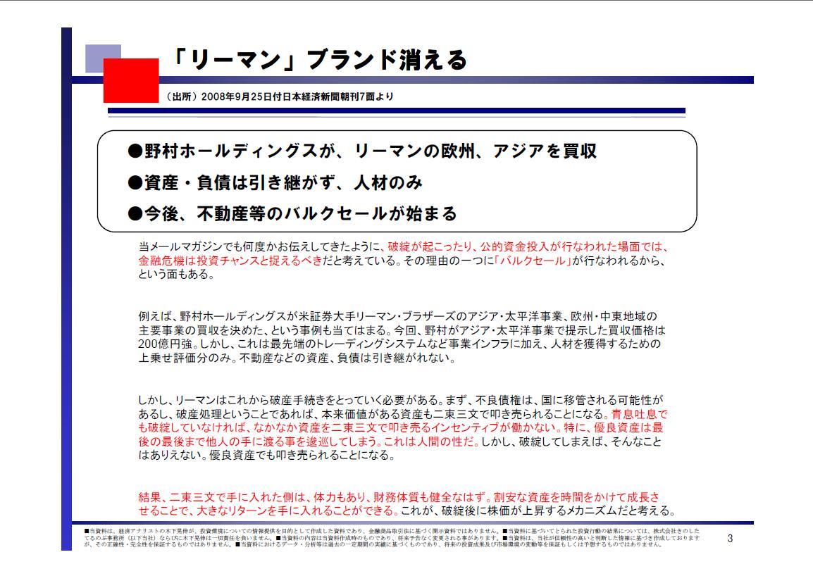 例えば、野村ホールディングスが米証券大手リーマン・ブラザーズの