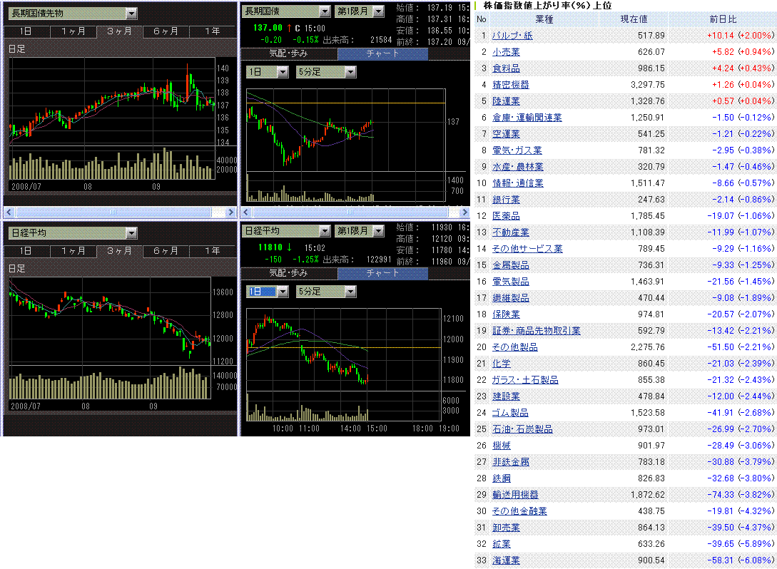 日曜日に米金融安定化策が大筋合意したことから、日経平均は朝方は反発してはじまりましたが、GLOBEX米株価指数先物が次第に下落していくに従い、日経平均もじりじりと下げていきました。全体的に商いが薄く、買い手不在といった感じでした。海運や鉄鋼などの景気敏感株の下落がきつかったです。ショートがたまっていそうな銘柄は妙に底堅いのですが、弱い銘柄はずぶずぶと沈んでいきます。