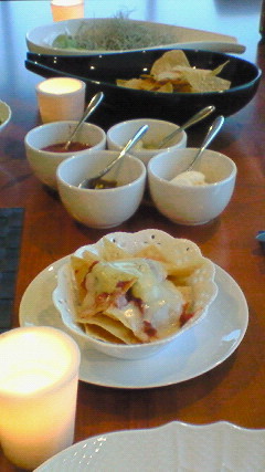 温めたトルティアに、レタスと、ハロペーニョ(辛いの)、先ほどナチョスにも使ったサルサ、グァカモーレ、サワークリームを敷き、その上に焼きたての鶏や野菜を乗せて食べます。