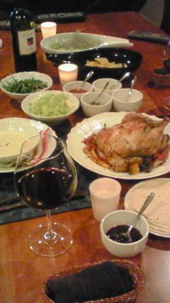 少し、違うバージョンで、鳥の腹の中に、ミンチ肉玉ねぎ、ナツメグ、カレー粉、少々、粒コショウなど入れて、タコ糸で結ぶ、オーブンに、入れる際に、オリーブオイル、岩塩マッサージ、焼き野菜に、セロリ、ズッキーニ、にんにくの芽、パプリカ、(香味類)パイナップル、出来上がり前に、チーズ、クルトン、イタリアンパセリ、を乗せて、余熱でおく、
