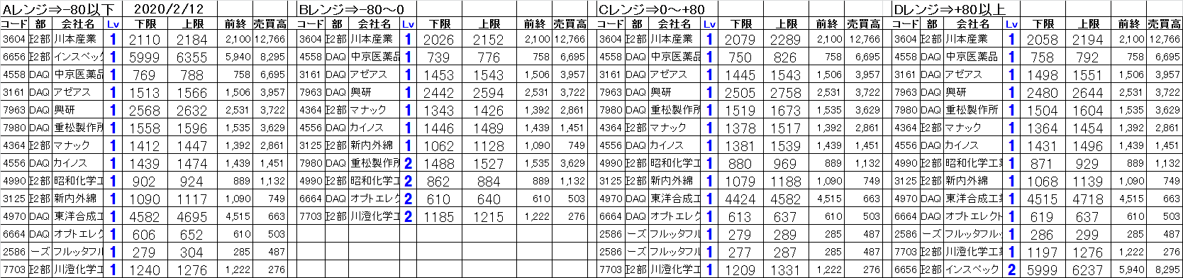 2020/2/12(水曜日)のシステムトレードの仕掛候補一覧はこんな感じです。