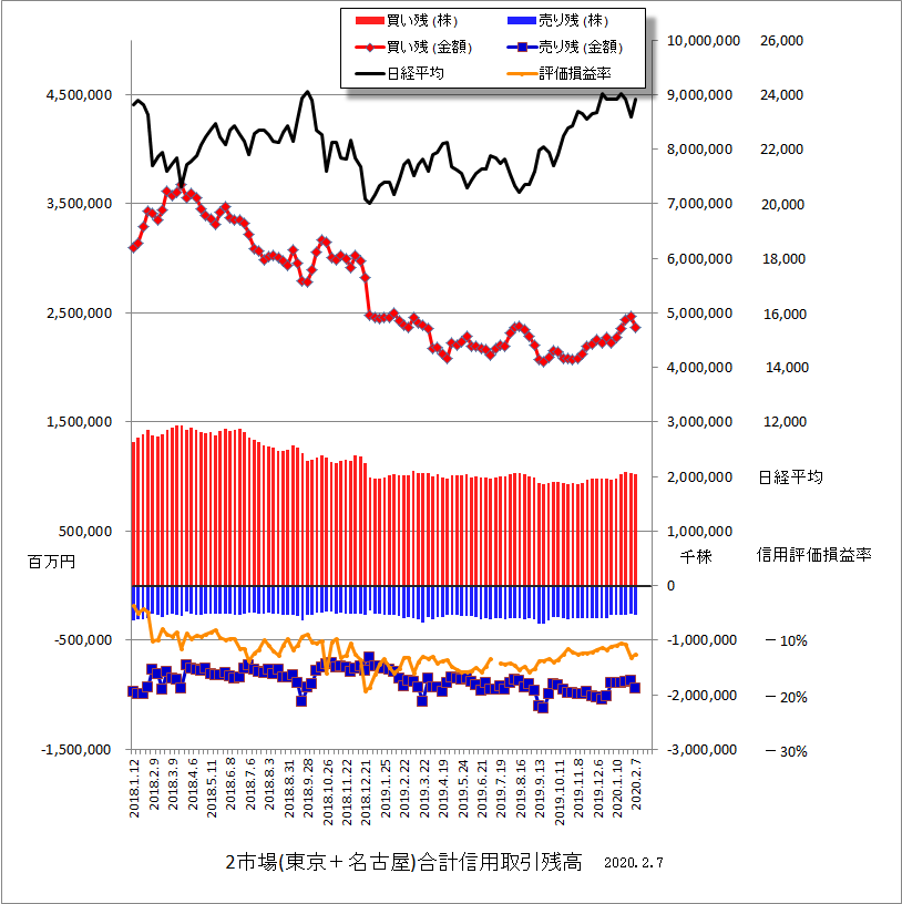 で、2/7現在の信用取引残高のグラフです。売り残が増えて買い残は減少、信用評価損益率はよくなっています。