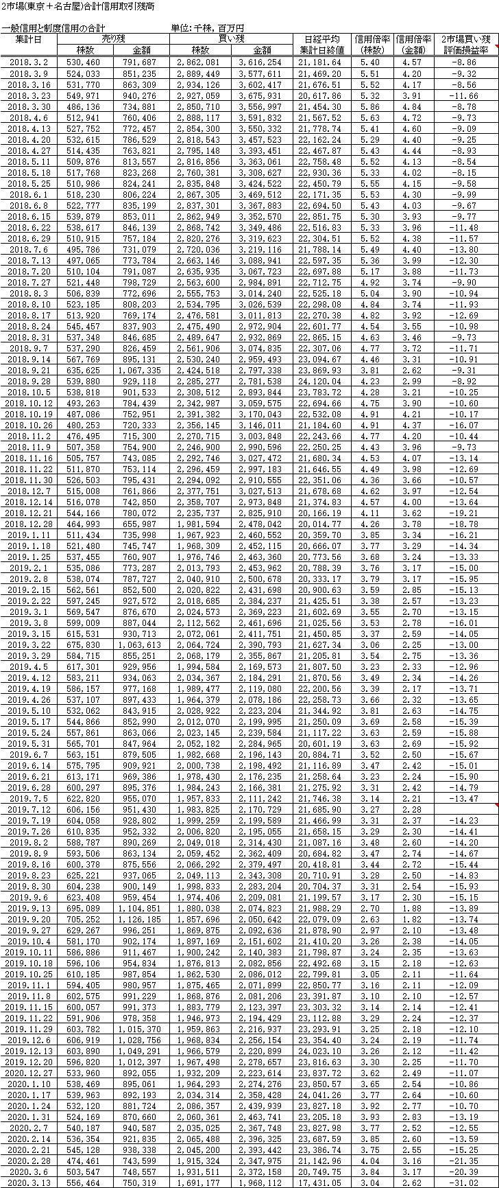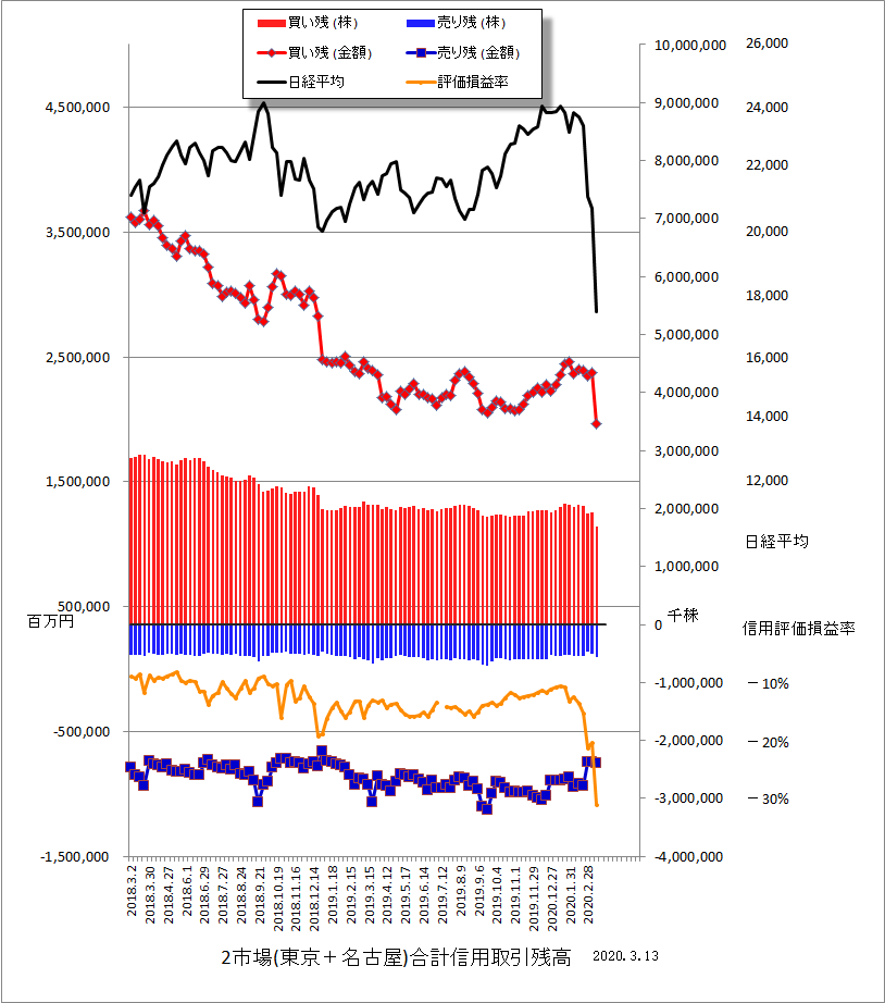 で、3/13現在の信用取引残高のグラフです。売り残が少し増えて買い残が減少なのですが、信用評価損益率はマイナス30%超と、大幅な悪化。