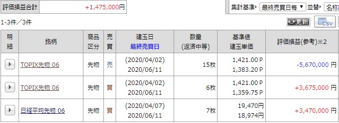 夜間引け時点での損益と建玉
