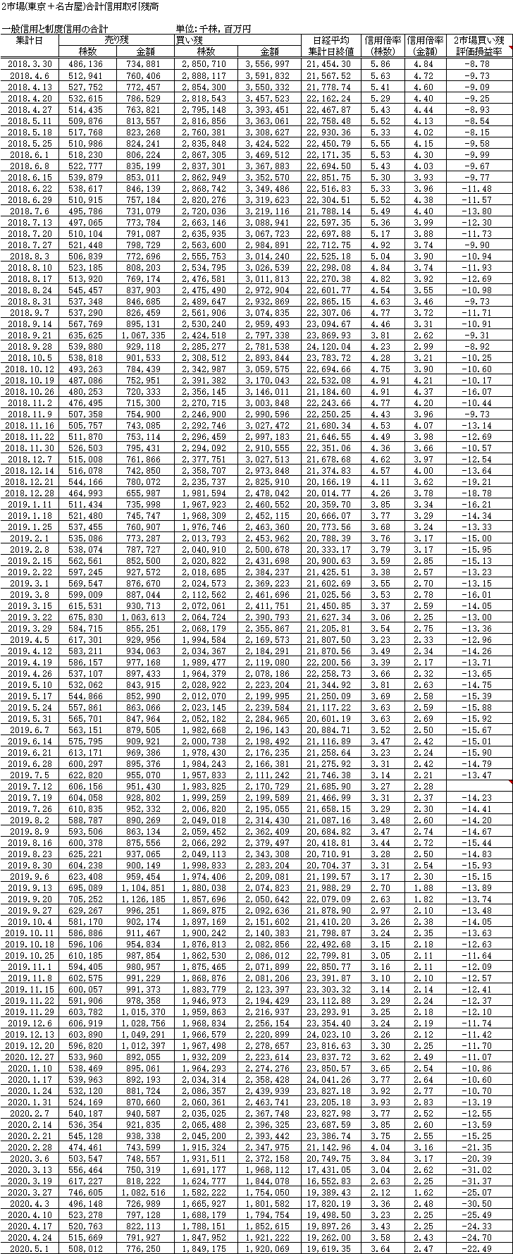 で、たまにはブログでもということで、5/1現在の信用取引残高のグラフです。
