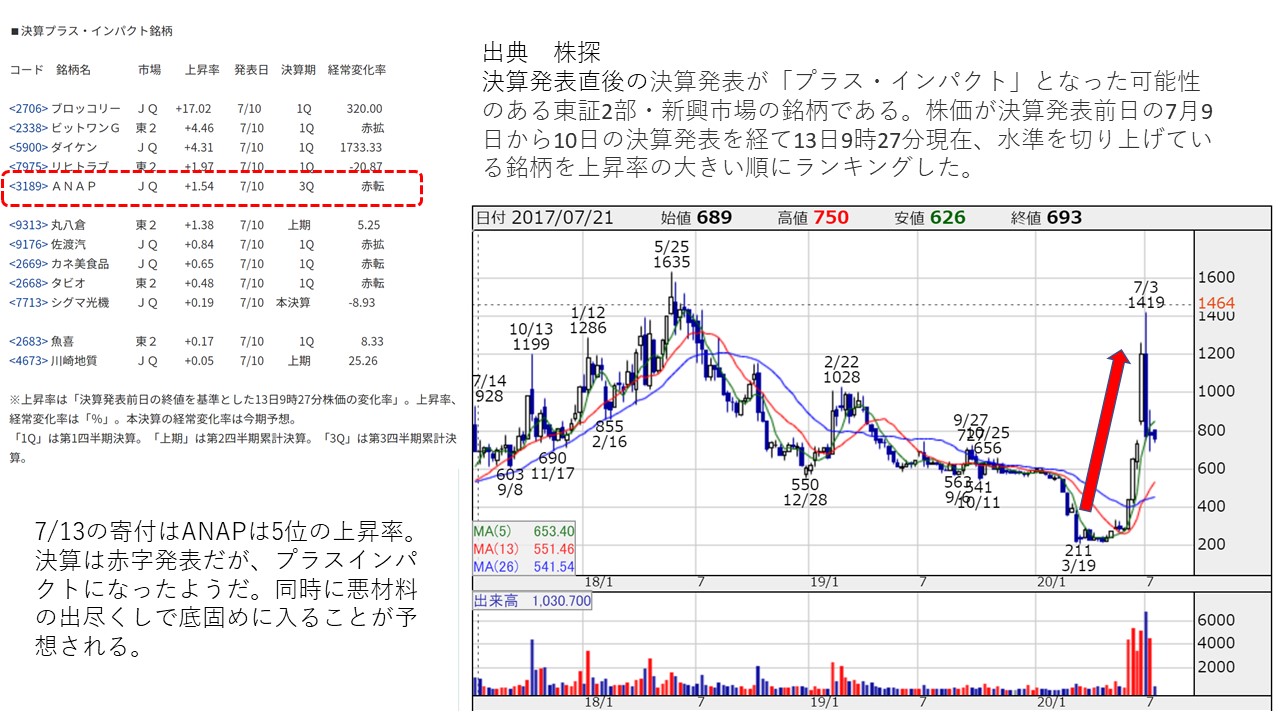 ANAP自体はこの数か月人気銘柄になっており、たった3か月でいったんは673%上昇(3/17:211円⇒6/30:1419円)まで値上がりした。