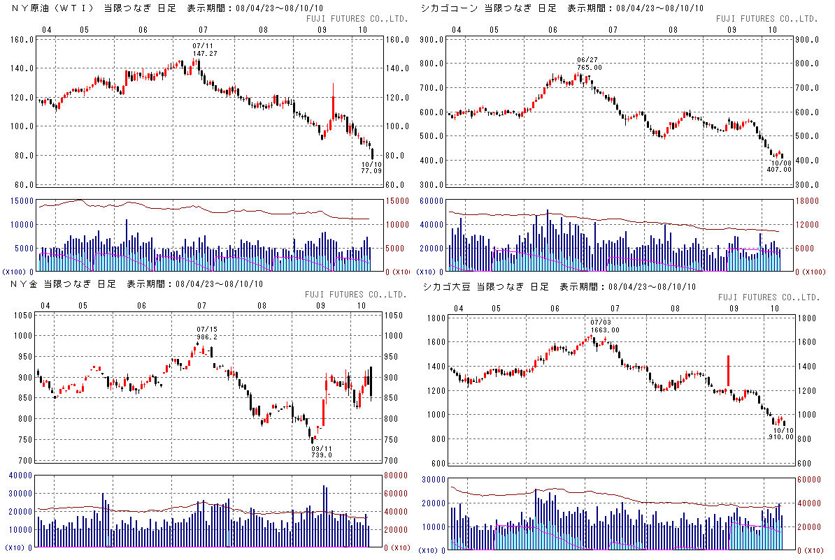 全体的に下落。原油価格(WTI)は80ドル割れ。3ヵ月でほぼ半値になりました。銅やニッケルなどの工業用コモディティも下落幅が大きかったです。本格的な不況になれば、これらのコモディティは需要が大きく落ち込みますから。