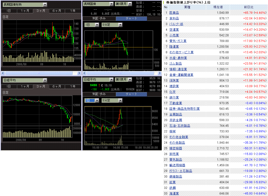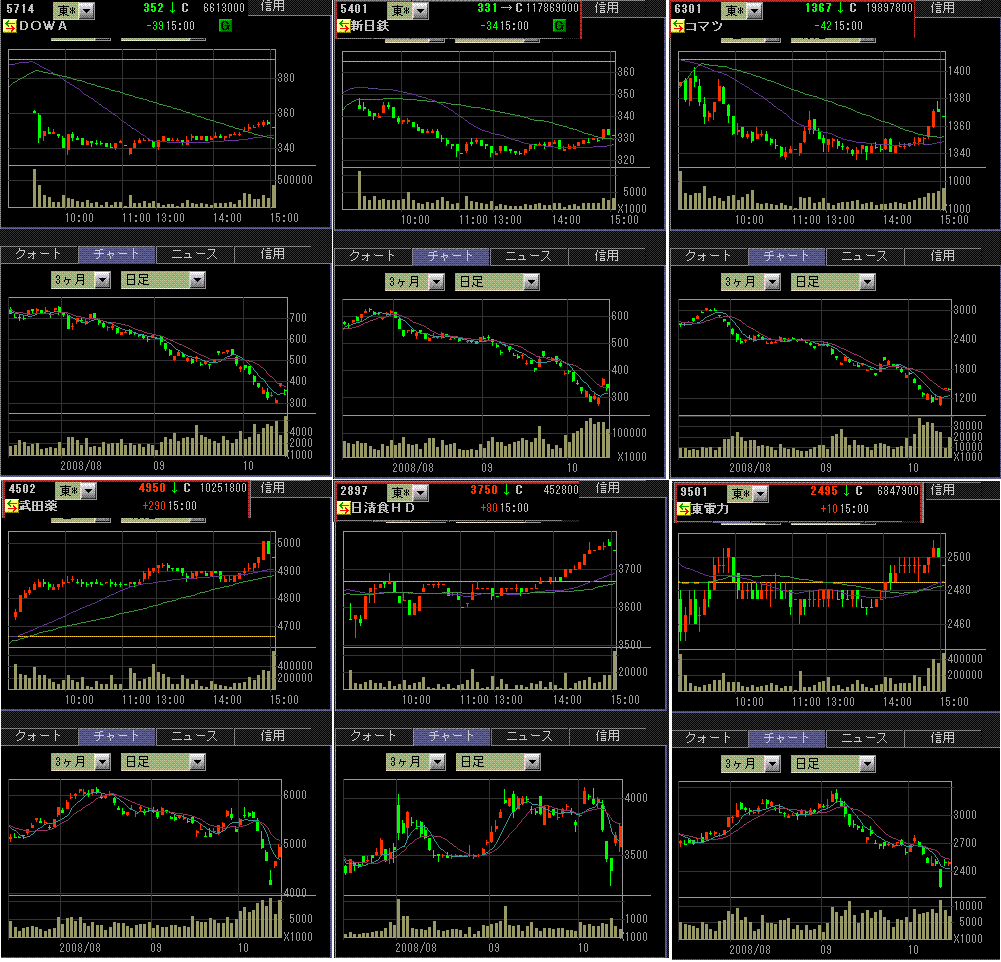 業種別の騰落を見ると、ディフェンシブに資金が行ってますね。景気悪化への警戒感が強いのでしょう。前日引け後に業績下方修正を発表したDOWAは前日比-10%でした。今日は鉄鋼・非鉄は下げているものが多かったとはいえ、ここまで下げ続けていてもまだ売られるんだなと思いました。