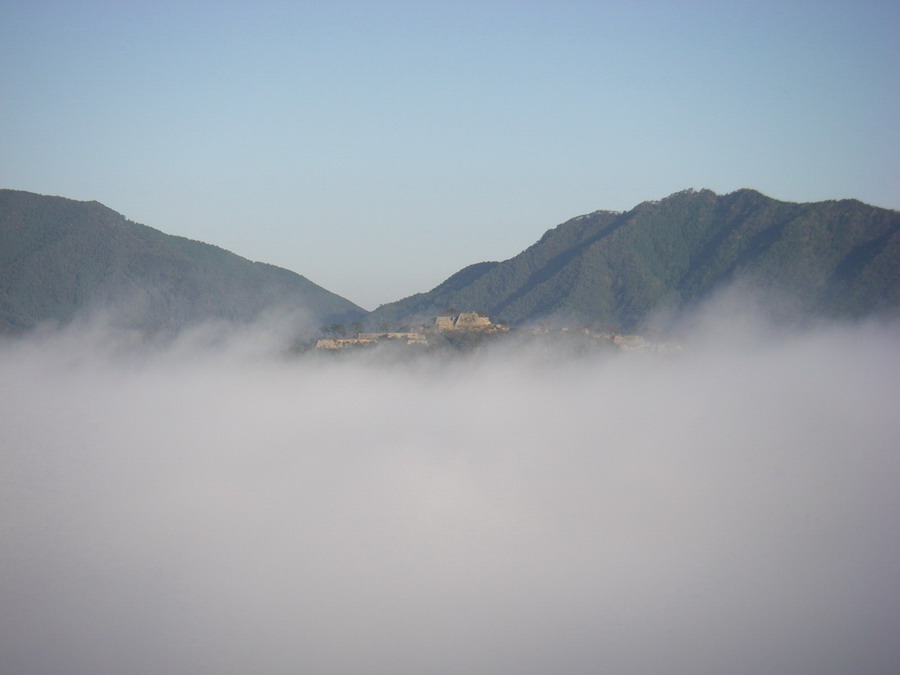 夜明けと共に立雲峡に登り城址を遠望します、朝霧も立ち込め雲間に浮かんでいるように見えました。