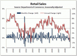 米商務省が15日発表した9月の小売売上高(季節調整済み)は、3755億ドルとなり、前月比1.2%減少となった。2005年8月以来3年1カ月ぶりの大幅な落ち込みで、市場予測の平均(0.7%減)より大幅に悪化した。売り上げ減は3カ月連続で前年同月比でも1.0%下回った。金融危機の影響で家計の消費抑制が急速に広がっており、米国の景気後退(リセッション)懸念が強まっている。