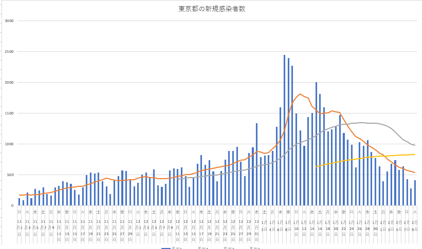 新規感染が何人以下、というなら、長期短期の移動平均よりどれくらい