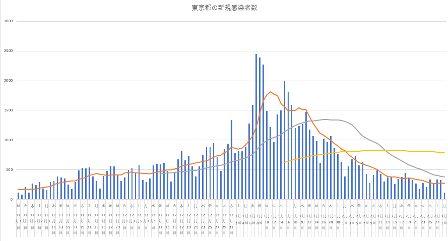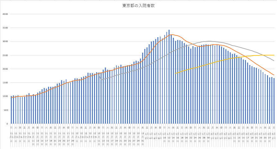 昨日からグラフだけの投稿にしています。まずは東京都の新規感染。新規や入院患者ががくっと減りましたが、1日のがくっだけでは、グラフの傾きは急には変わりません。
