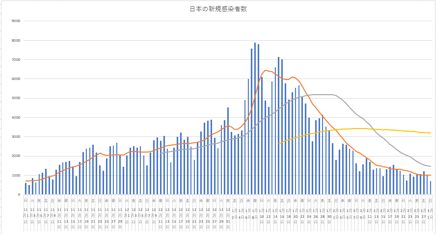 次に日本の新規感染者数。首都圏にくらべると減少傾向が強いようですね。