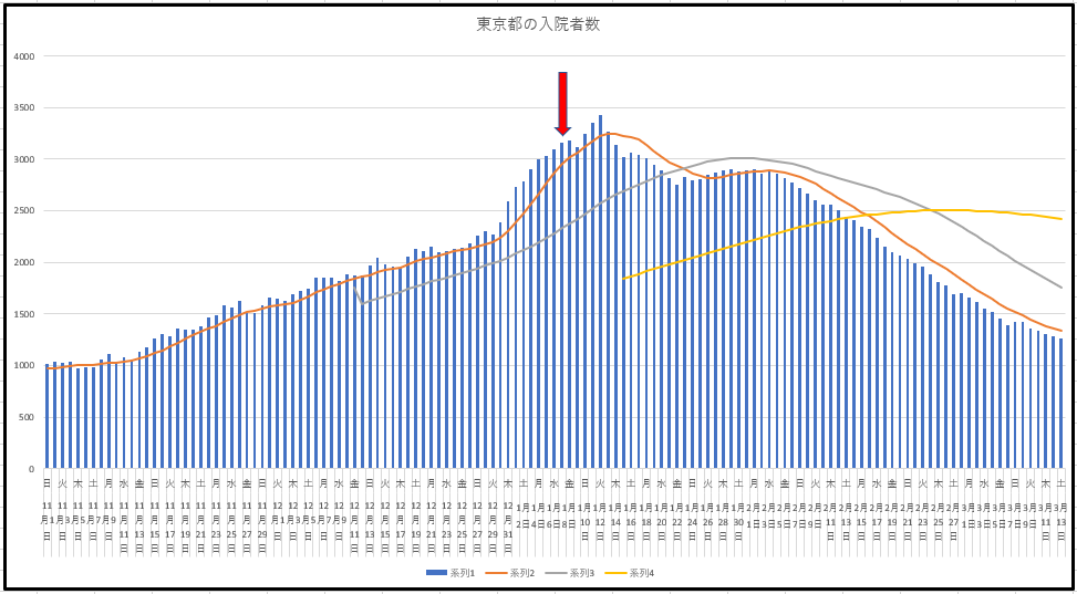 東京の新規感染と入院患者数の推移。東京のデータは毎日朝の9時に締め切って諸々を集計し午後3時に発表される。つまり今日発表のデータは実質昨日の実績なのだ。今日のだけ見ると完全にゴールデンクロスで上昇に転じる風だが、本来少ないはずの日月がどうなるか、ですね。