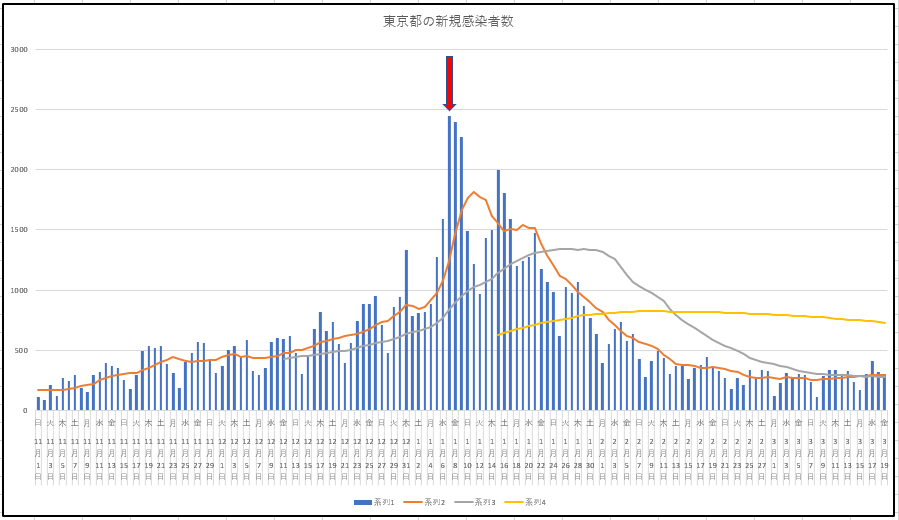 まず東京の新規感染。左端の昨年11月初旬と比べて十分低いといえないが、ここ2日ほど前週の同曜日を下回った。つまり7日移動平均は下降。これを上昇という報道があったのでよく見ると、1週間前の7日移動平均値と比べたら上、ということだそうだが、たしかにそうだ。どちらにしても微動ですが(^^);