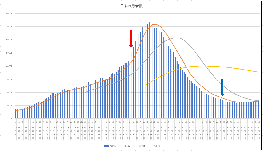 東京都の入院数のグラフの宣言解除の矢印が赤い