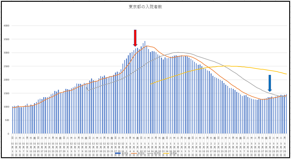 というわけで今朝は、まず昨日の東京都と日本の新規感染の推移を添付して、コメにてそれぞれの入院および患者数の推移を添付します。木金にかけてさらに上昇が顕著になるでしょうね。宣言はいいから飛沫感染に注意しましょう。