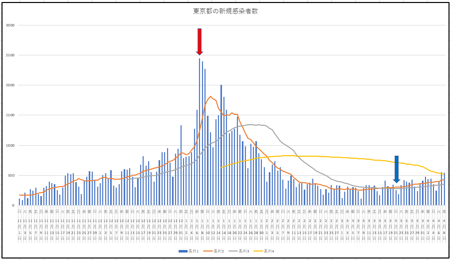 東京と日本の新規。大阪の新規感染はグラフにしてないけど日本全体の内の4分1以上継続中なので日本の傾向は今や大阪(関西)の傾向とみてもよさそう。でも、ご心配なく。東京もすぐ追いつきますよってに(**)b