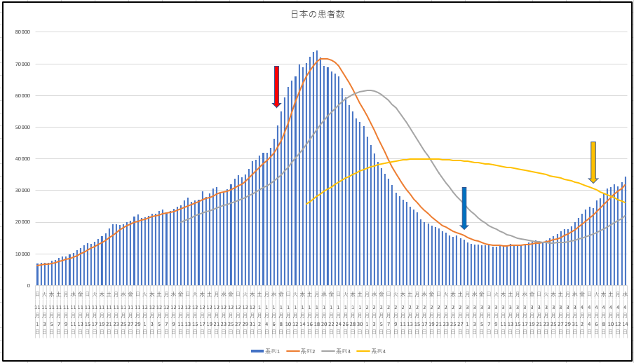 日本の新規と患者数の推移。患者数は明確な上昇トレンドになっている。上記の東京データは、入院数でやや減少傾向だが、現存する軽症、観察中を含めた陽性者数を把握していないので、単純比較はできない。