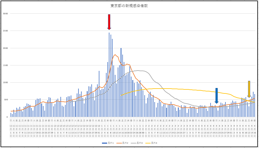グラフは東京都の新規感染者数の推移。下降トレンドにはならなかったようだ。残念ね。長短期の移動平均線のGCが発生しそう。タグ