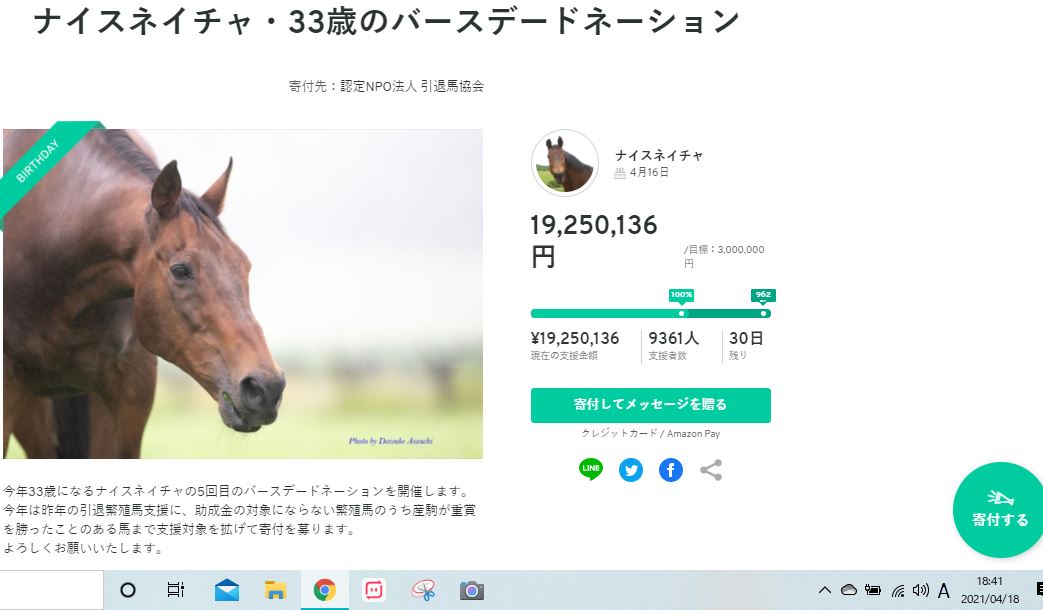 なんと、競走馬引退したナイスネイチャが33歳を迎えました。人間だと90歳以上の長寿だそうです。引退馬については、全般に厳しい現実があるようです。年間7,000頭近くの生産数とほぼ同数が処分されているようです。そんな引退馬への保護のための寄付、今年は「ウマ娘」の効果と思いますが、尋常ならざる寄付額が集まっています。目標200万を達成し300万に上方修正しましたが、開始2日程度の4/18 18:41で1925万、(約10分後には1927万になっていました。)寄付の募集はあと30日あるようです。こういった活動が周知されると、よいですね。 この「ナイスネイチャ・33歳のバースデードネーション」は以下へ認定NPO法人 引退馬協会https://syncable.biz/campaign/1589/どこまで集まるのか気になりますね。寄付については、皆様もご検討ください。