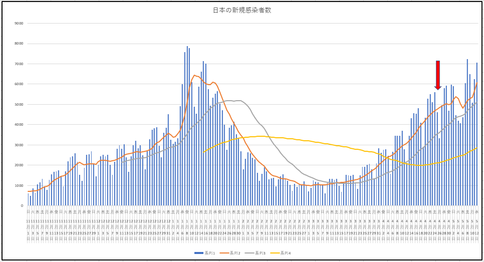 12日までの日本の新規と患者数の推移。福岡と愛知と北海道がピンチのようだ。